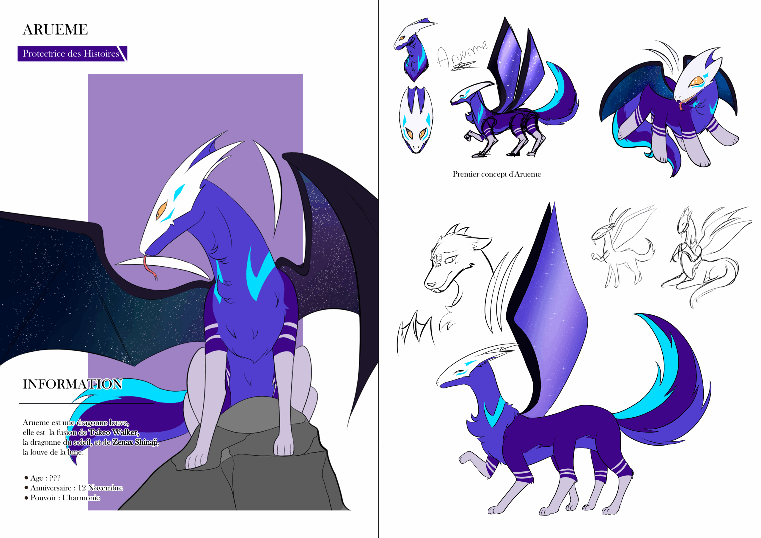 Arueme est la fusion de la dragonne du soleil et de la louve de la nuit. Elle est la protectrice des Histoires et elle est comme une étoile, elle illumine la plus sombre des nuits. Elle nous représente tellement que cela est difficile pour nous d’arrêter de l’associer à nous. Elle nous protège aussi dans un sens~
